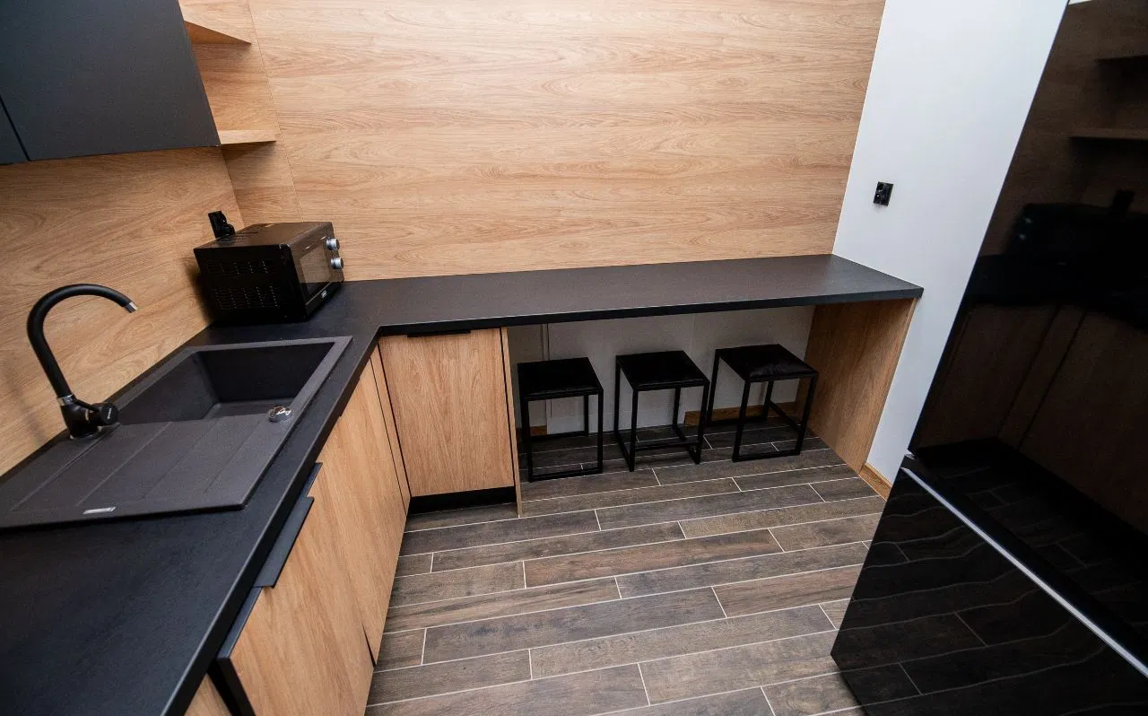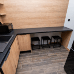 - Część socjalna: nowoczesna powierzchnia socjalna (35 m²) obejmująca m.in. aneks kuchenny, łazienkę, toaletę oraz miejsce do wypoczynku.